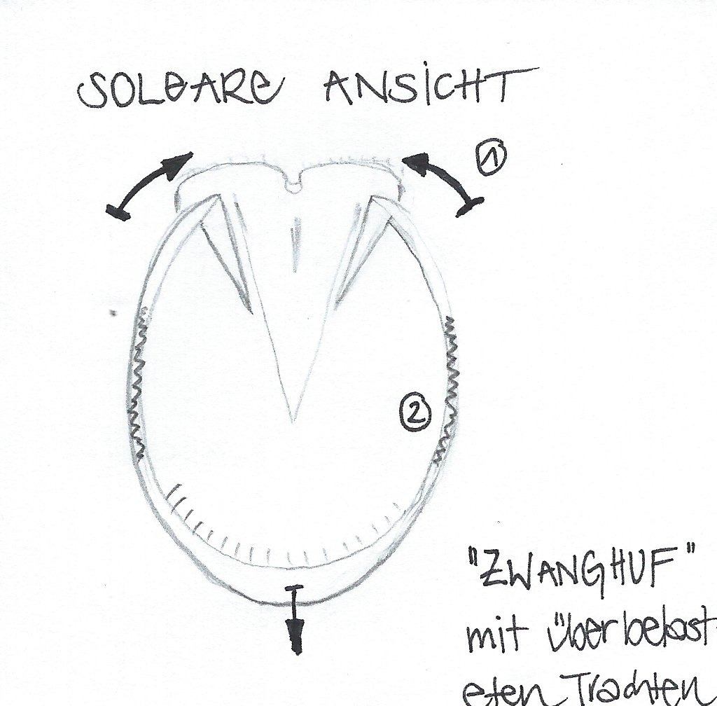 Wird ein Huf nicht gleichmässig belastet bzw. abgerieben kommt es in der Folge zu Deformationen und es sind verschiedene Symptome sichtbar. Folgende Zeichnungen habe ich aus meinen Unterlagen abgezeichnet, in der Praxis sind häufig Mischformen davon vorzufinden.