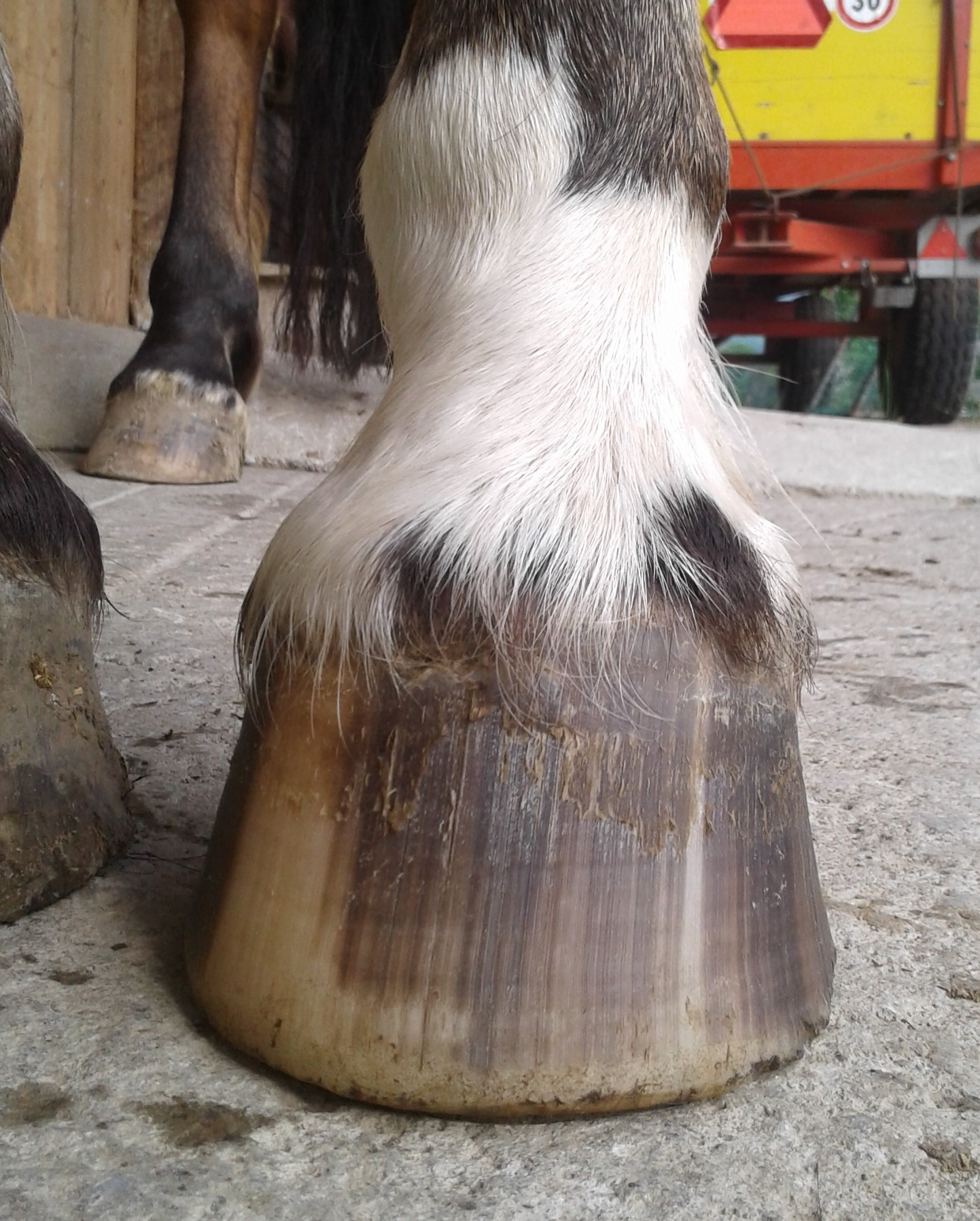Wie beim asymmetrischen Huf sind die beiden steilen Seitenwände hohen vertikalen Scherkräften ausgesetzt. Dadurch wird der Tragrand aufgespreisselt und es können sich hohle Wände bilden.
