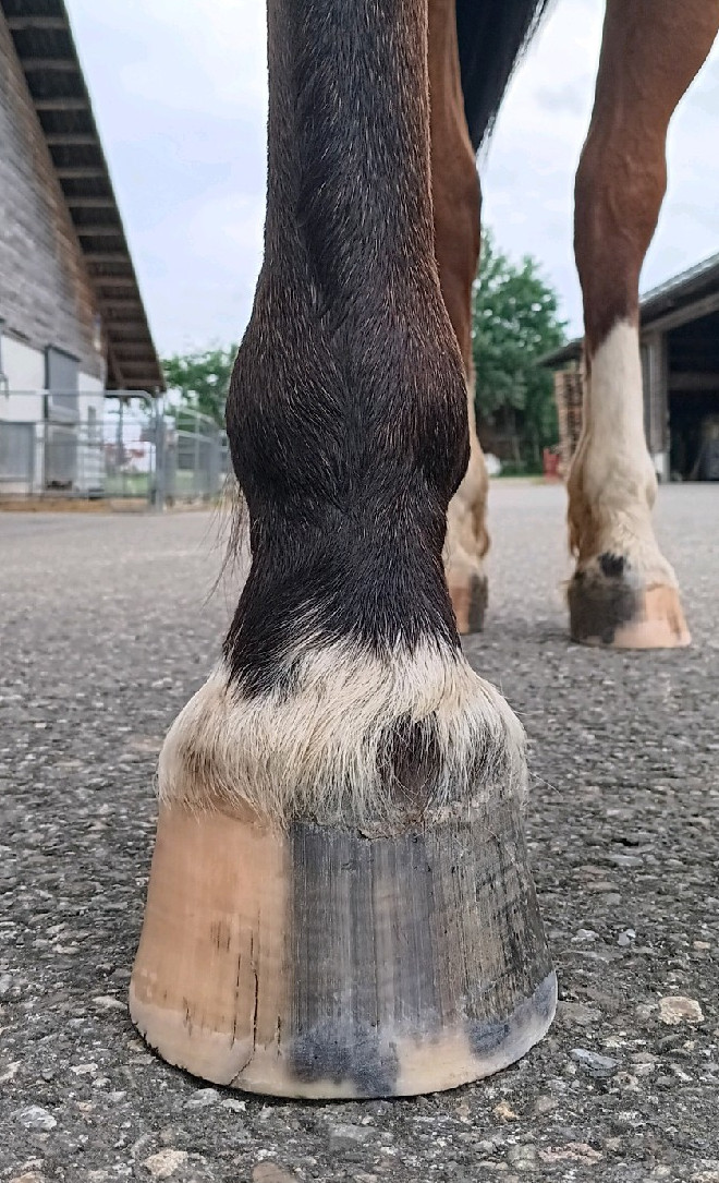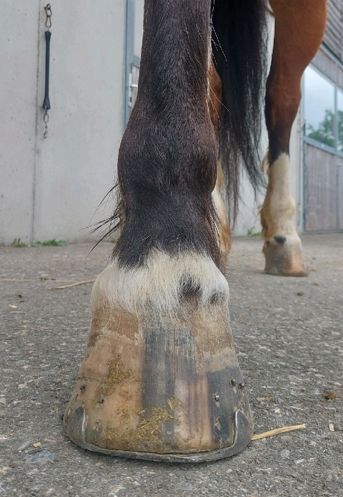 Der gesamte Huf wirkt harmonischer und gleichmässiger belastet. Die Hornkaspel ist weniger rissig und rau, sondern das Horn wirkt gesund und widerstandsfähig. Nun kann er optimaler belastet werden.