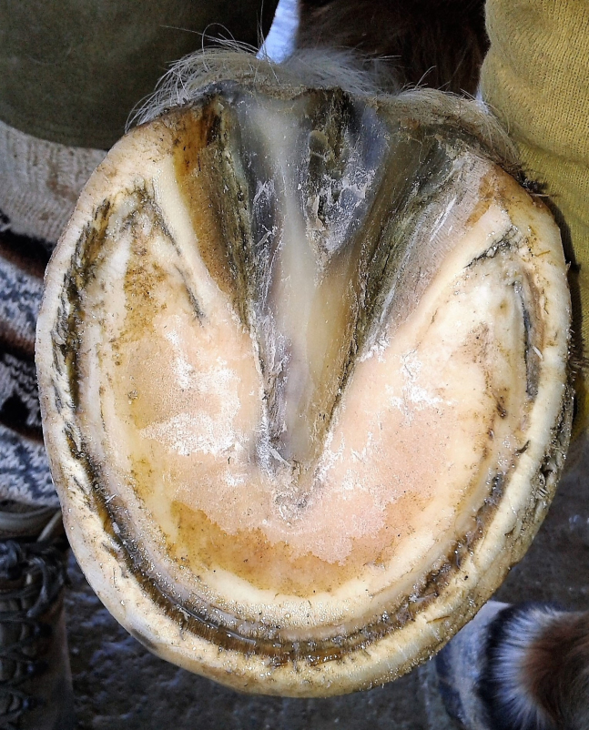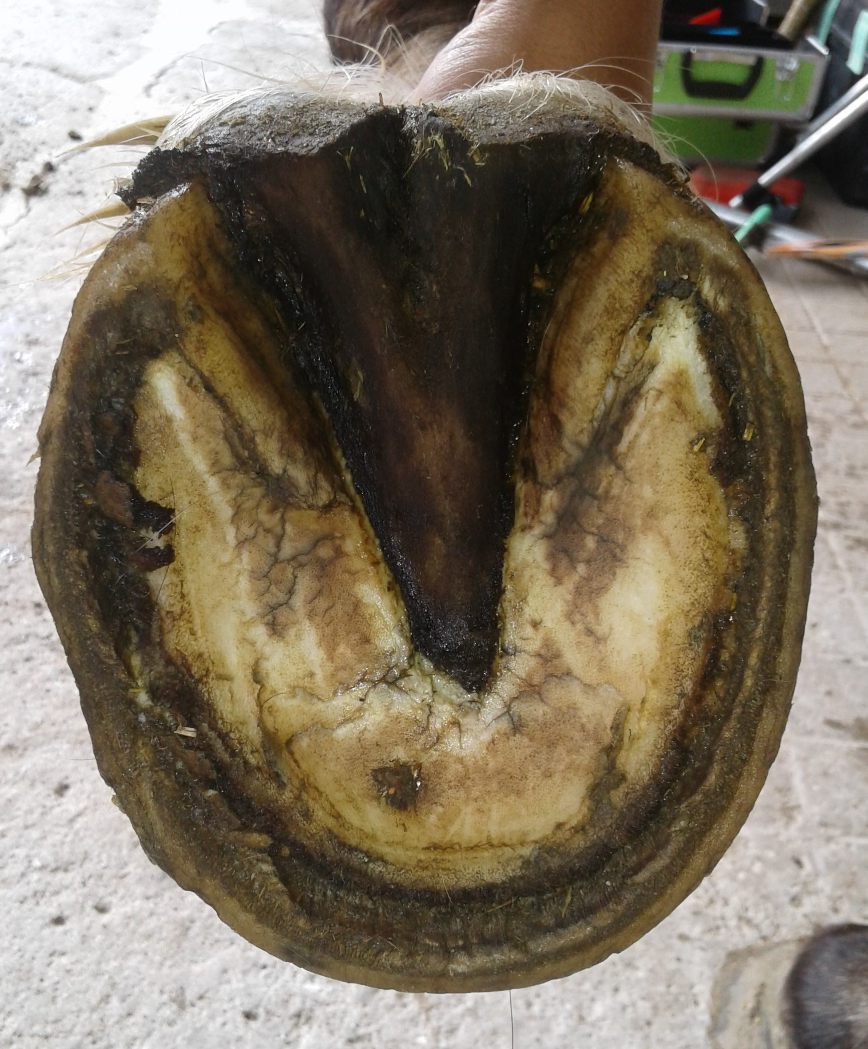 Die gesamte Hornkaspel wirkt rau und rissig. Man erkennt gut die Demarkationslinie, die ausgeprägte Falte fast mittig im Huf. Sie entsteht häufig bei einer optimalen Bearbeitungsweise und zeigt quasi der Beginn der Arbeit. Bis zum Zeitpunkt der Aufnahme habe ich schon ca. 5 Monate daran gearbeitet, im 4 Wochen Intervall.