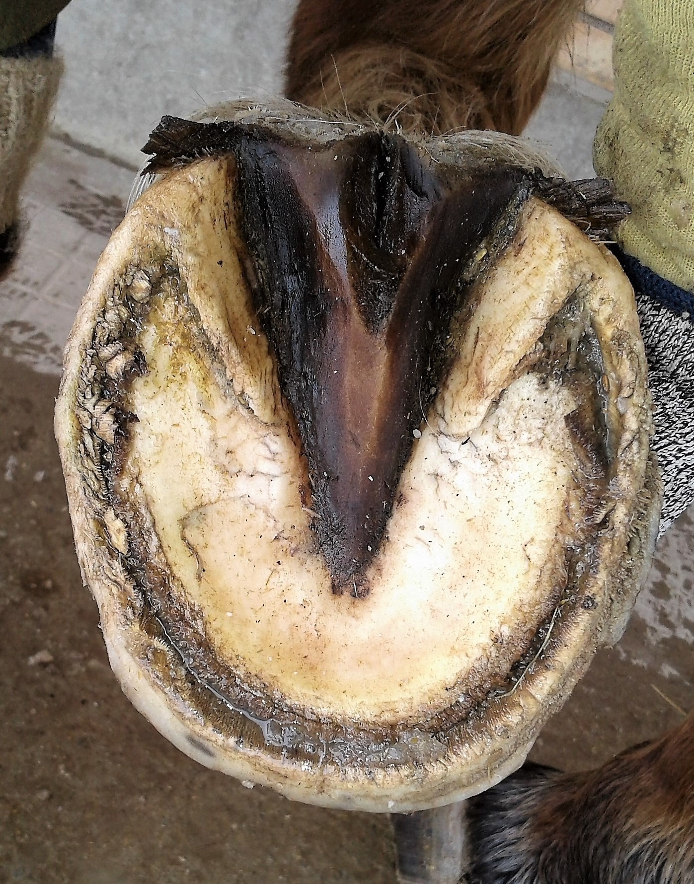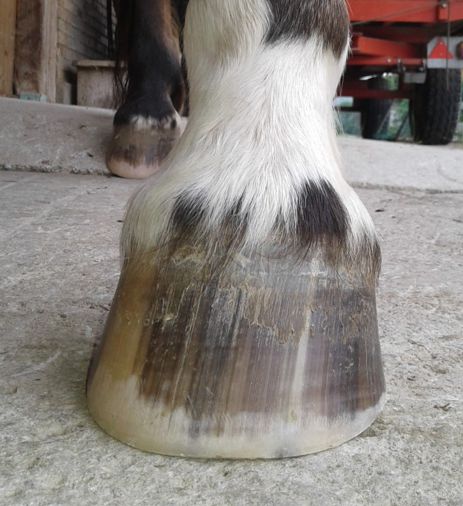 Der Huf wird sehr stark medial (innen) belastet. Man erkennt es an dem abfallenden Kronrand, die steil zum Boden stehenden inneren Hufwand (medial) und die schräg zum Boden stehende äussere Hufwand (lateral).