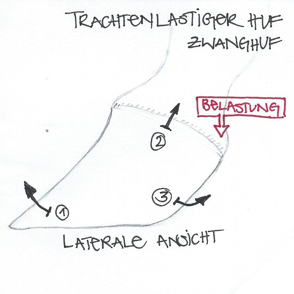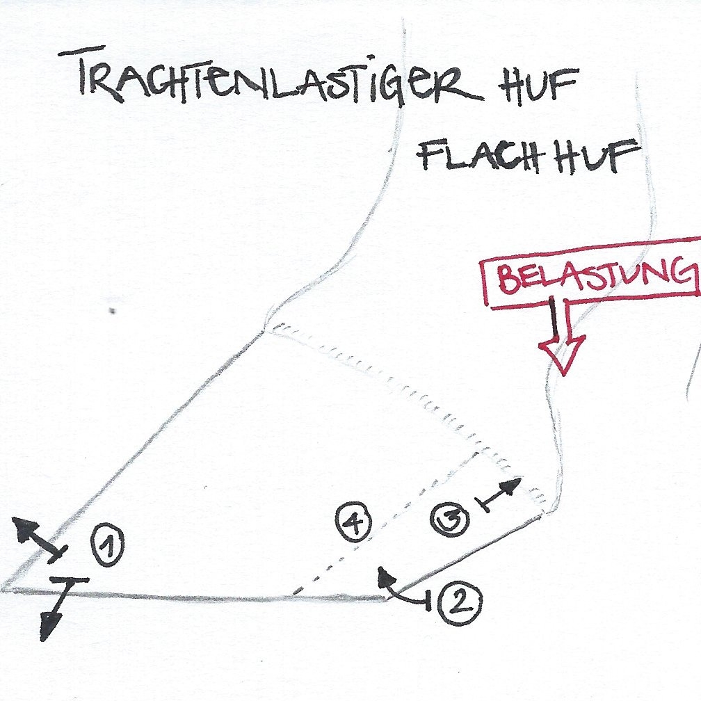 1. Diese, in einem steilen Winkel zum Boden stehende Hufwand, schiebt nach oben und ist dadurch hohen vertikalen Scherkräften ausgesetzt = dadurch aufgespreisselter Tragrand und hohle Wand (4).