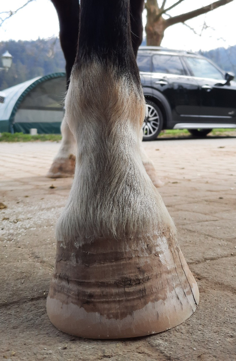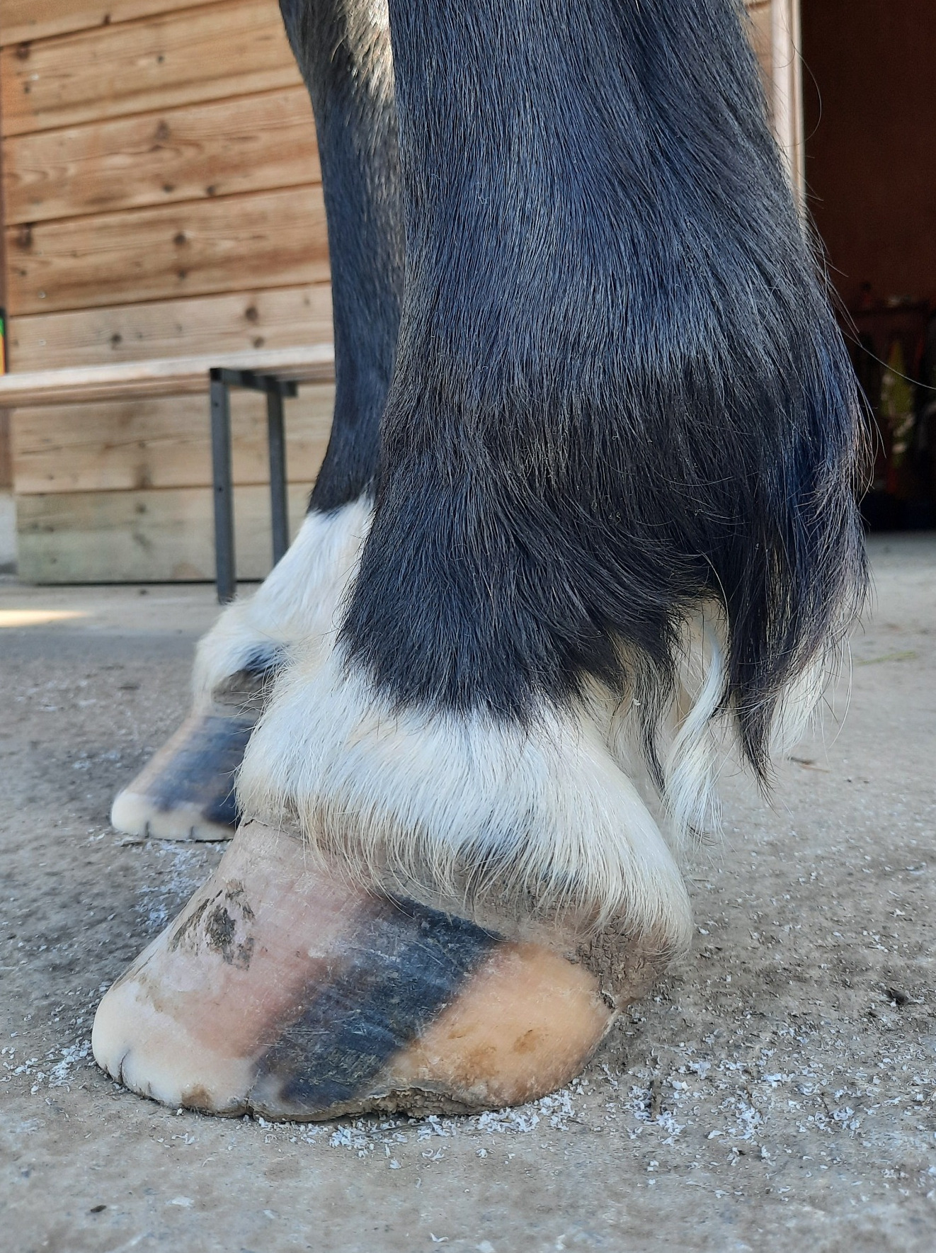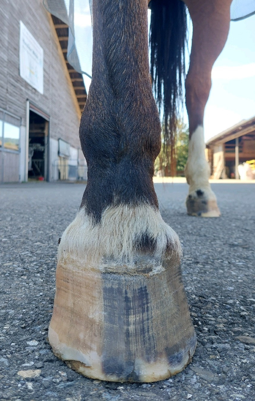 Der gesamte Huf wirkt harmonischer und gleichmässiger belastet. Die Hornkaspel ist weniger rissig und rau, sondern das Horn wirkt gesund und widerstandsfähig. Nun kann er optimaler belastet werden.