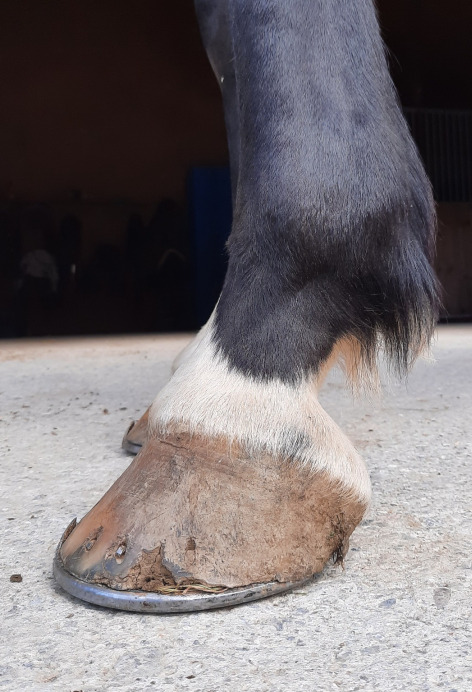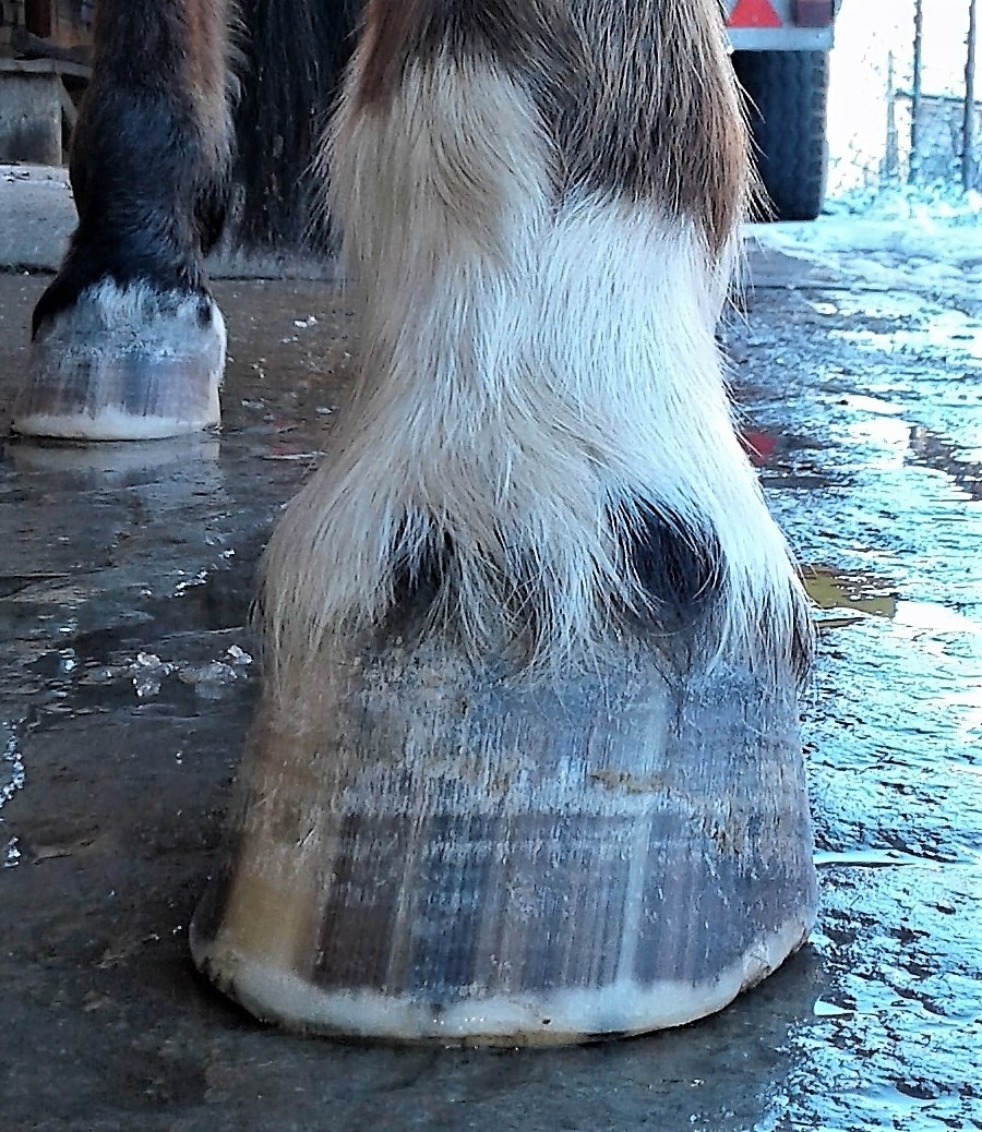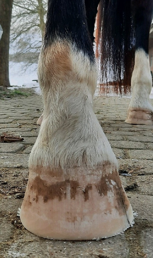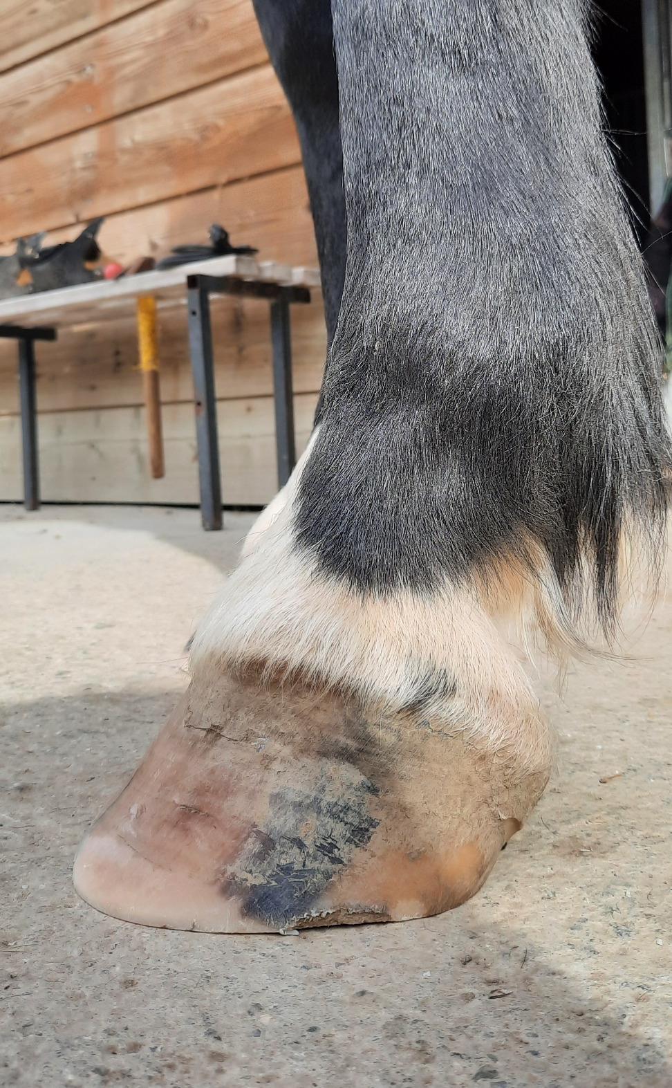 Der gesamte Huf wirkt harmonischer und gleichmässiger belastet. Die Hornkaspel ist weniger rissig und rau, sondern das Horn wirkt gesund und widerstandsfähig. Nun kann er optimaler belastet werden.