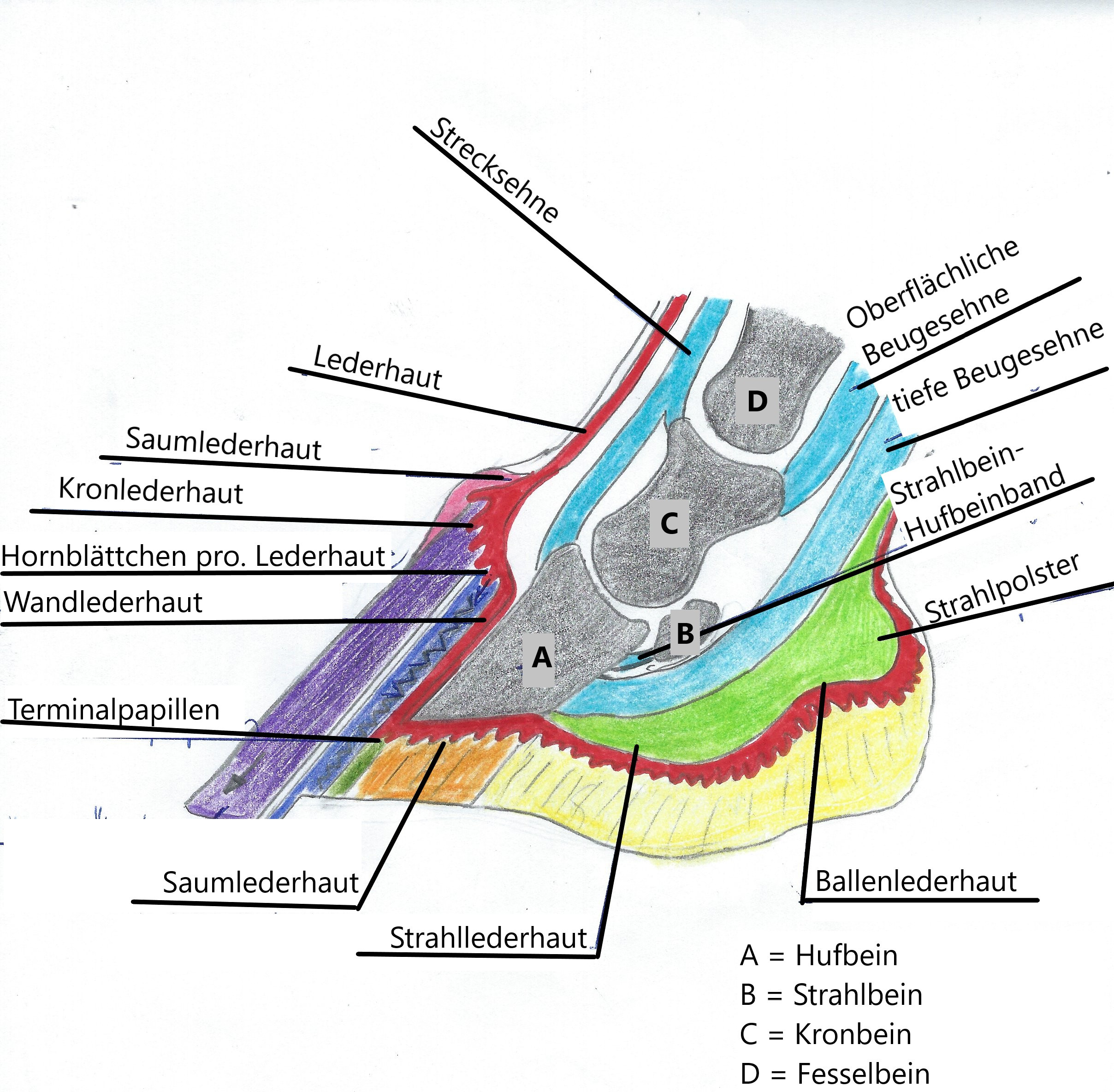 Der Pferdehuf kann mit der Fingerspitze des Menschens verglichen werden. Was bei uns der Fingernagel ist, ist beim Pferd die Hornwand. Der Knochen des unteren Fingergliedes ist beim Pferd das Hufbein.