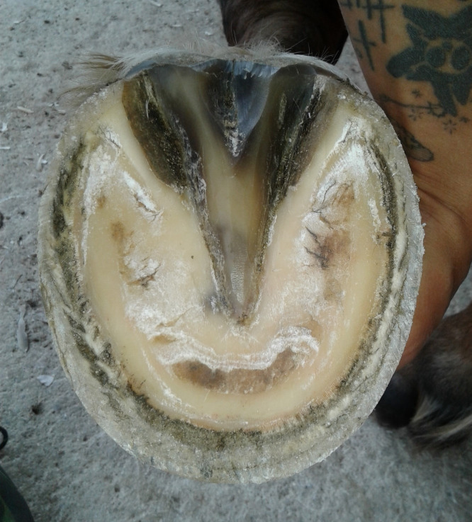 Der Huf wird sehr stark medial (innen) belastet. Man erkennt es an dem abfallenden Kronrand, die steil zum Boden stehenden inneren Hufwand (medial) und die schräg zum Boden stehende äussere Hufwand (lateral).